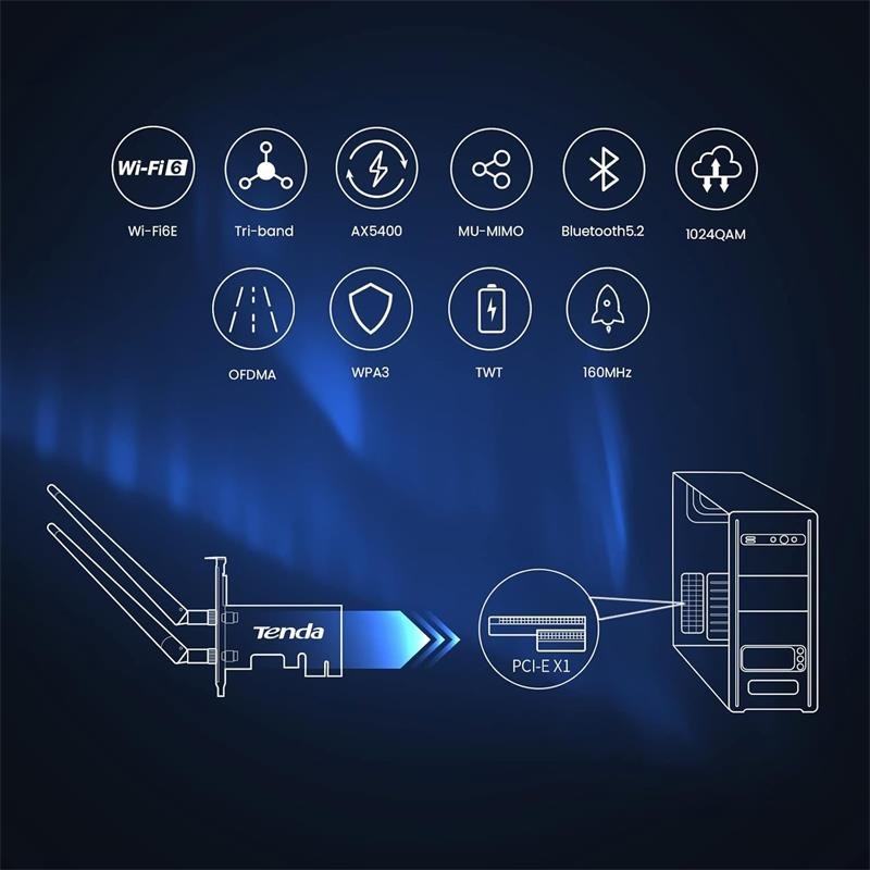 La Tarjeta de Red Tenda PCIe WiFi 6E AX5400 Tri-Band E33 es un adaptador de red de alto rendimiento diseñado para mejorar la conectividad inalámbrica de tu PC. Este dispositivo ofrece una velocidad máxima de 5400 Mbps y es compatible con la tecnología Wi-Fi 6E, que soporta tres bandas: 2.4 GHz, 5 GHz y 6 GHz. Esto permite un rendimiento superior, ideal para juegos, transmisión de video en 4K y otras aplicaciones que requieren alta capacidad de ancho de banda.