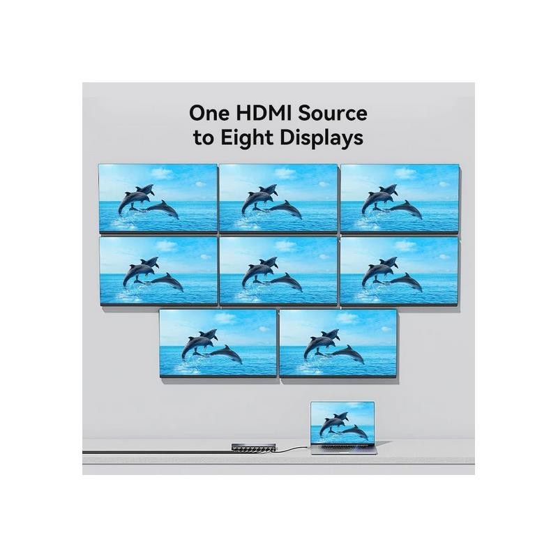 Divisor HDMI Vention AKQB0-EU de 1 entrada y 8 salidas, ideal para distribuir señal 4K a 30Hz a múltiples pantallas con fácil instalación y sin pérdida de calidad.