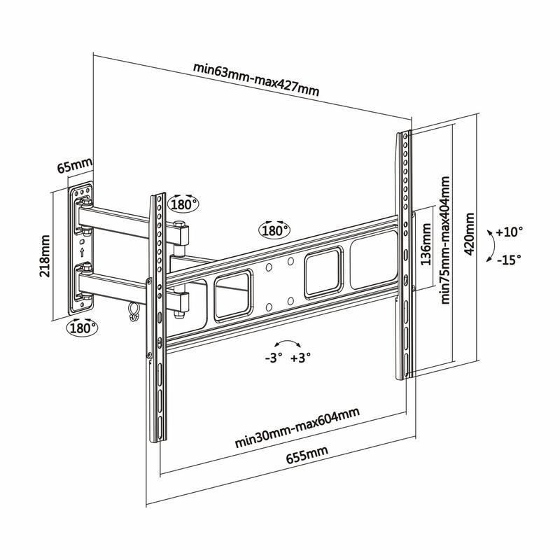 Ángulo de nivelación: -3º / 3º. Distancia de la pared: ajustable entre 63 y 427 mm (depende de la instalación y del espacio disponible). Manual de instrucciones varios idiomas.