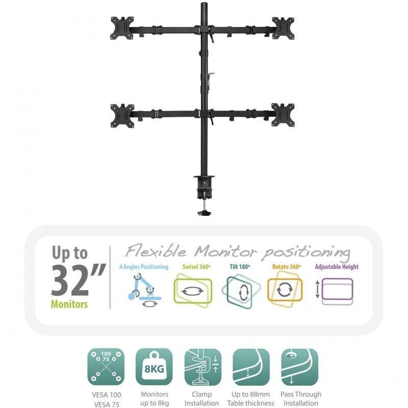 Cree un entorno de trabajo ergonómico y que ahorre espacio utilizando el soporte de escritorio EW1514 cuádruple (2 x 2), completamente metálico y ergonómico para monitores de hasta 32 pulgadas y 8 kg cada uno con estándar de montaje vesa. Solución de ahorro de espacio para mantener su escritorio ordenado y limpio.
