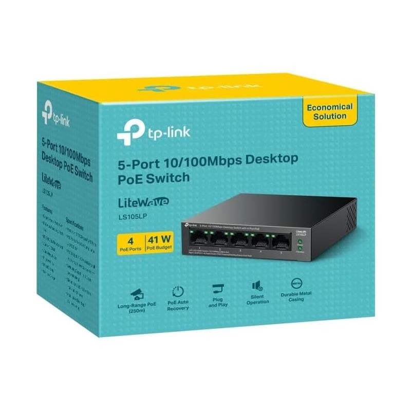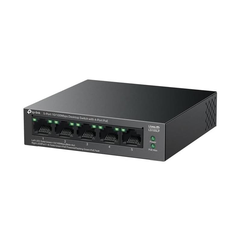 El TP-Link LiteWave LS105LP es un switch de escritorio diseñado para facilitar la conectividad de red y la alimentación eléctrica de dispositivos mediante la tecnología Power over Ethernet (PoE). Con 5 puertos Fast Ethernet (10/100 Mbps), este switch permite conectar dispositivos como cámaras IP, teléfonos VoIP y puntos de acceso con un solo cable Ethernet, reduciendo la complejidad del cableado y optimizando el espacio.