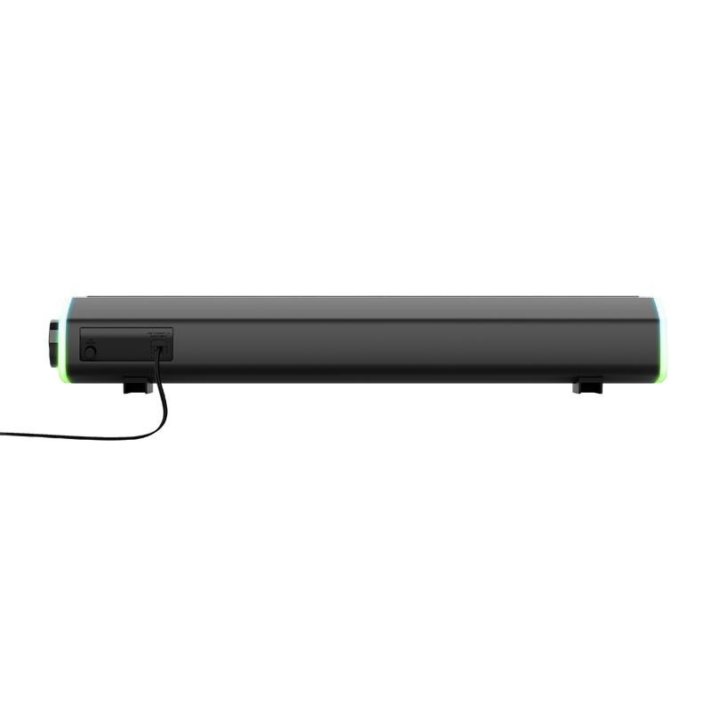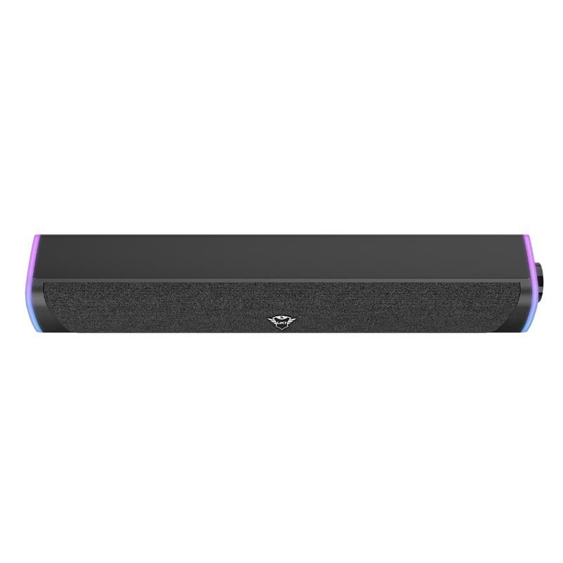 Barra de sonido para gaming Trust GXT 620 Axon con iluminación RGB en ondas de arco iris y volumen de fácil acceso. El diseño compacto de la barra de sonido permite que se pueda colocar fácilmente debajo de una TV o de un monitor de PC, mientras que los 12W de potencia ofrecen cualquier cosa menos un sonido mínimo.