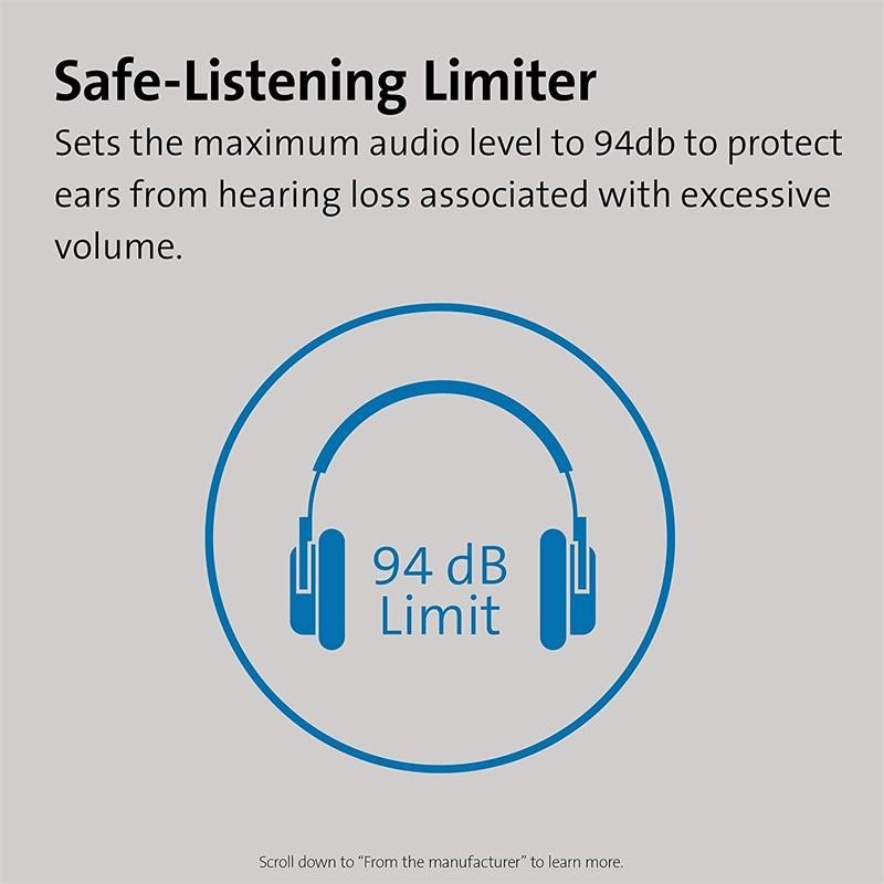 - El limitador de escucha segura establece el nivel de audio máximo en 94 db para proteger los oídos de la pérdida auditiva asociada a volúmenes muy altos.