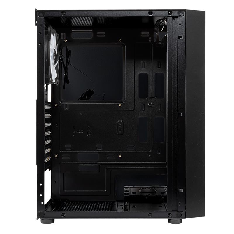 El diseño de su frontal sorprende con su diseño ARGB y la posibilidad de instalar hasta 3 ventiladores de 120 mm. Glayze Black cuenta con un panel lateral de cristal templado que favorece el efecto pantalla total. De este modo, quedan expuestos todos los componentes del equipo, generando un efecto muy demandado por los usuarios.