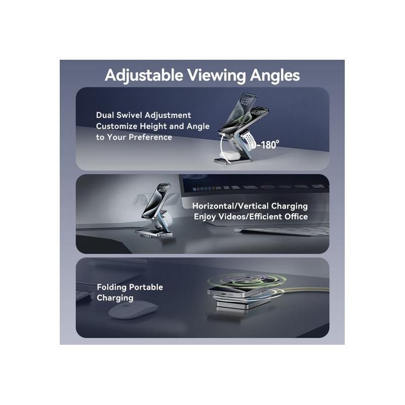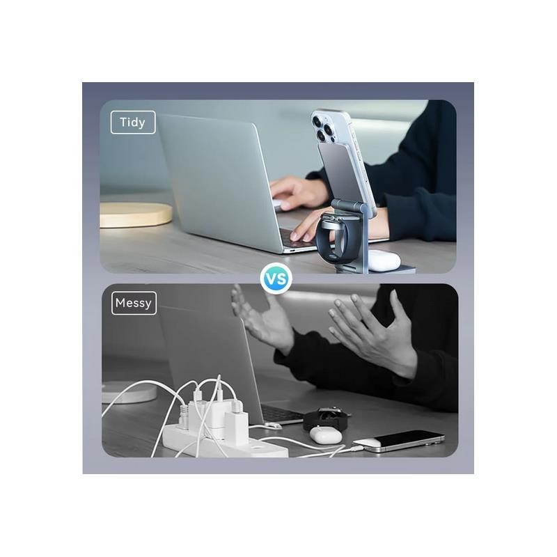 Carga simultánea: Permite cargar tres dispositivos al mismo tiempo: iPhone, Apple Watch y AirPods.