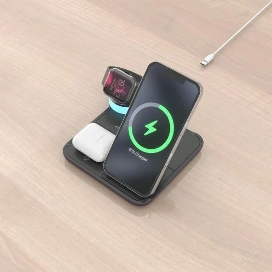 Eficiencia profesional para multi-dispositivo. Este cargador inalámbrico 4 en 1 centraliza la carga de tu smartphone, Apple Watch y auriculares compatibles con Qi, brindando comodidad absoluta y reducción de cables en cualquier espacio técnico o de trabajo intensivo. Su diseño plegable y portátil con ángulo ajustable de 0 a 80° permite adaptar la base para uso de escritorio, videollamadas o consulta de notificaciones mientras cargas todos tus dispositivos en simultáneo.