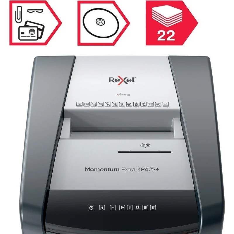 Las destructoras de papel sin atascos Rexel Momentum Extra son ideales para destruir documentos confidenciales en la oficina. La destructora XP422+ destruye hasta 22 hojas de papel A4 (80 grs) de una sola vez a través de la ranura de alimentación manual en piezas de corte transversal P-4 (4x35mm). L
