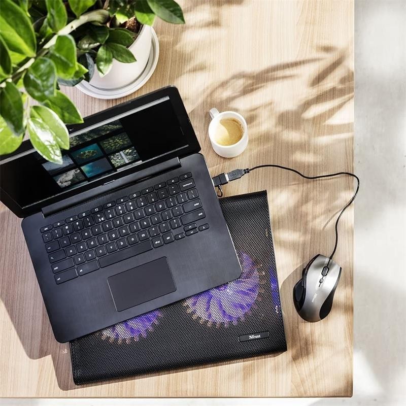 Soporte de refrigeración para ordenadores portátiles con ventiladores iluminados en azul para escribir cómodamente y disfrutar de la mejor refrigeración.