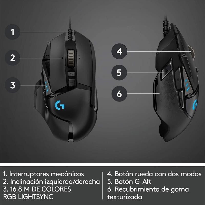 Tu ratón para gaming de alto rendimiento favorito ofrece más funciones y precisión que nunca. Personaliza la iluminación RGB para que coincida con tu estilo y entorno o sincronízala con otros productos Logitech G. El ratón para gaming de alto rendimiento G502 incluye nuestro sensor óptico HERO 16K de próxima generación para máxima precisión y seguimiento superior.