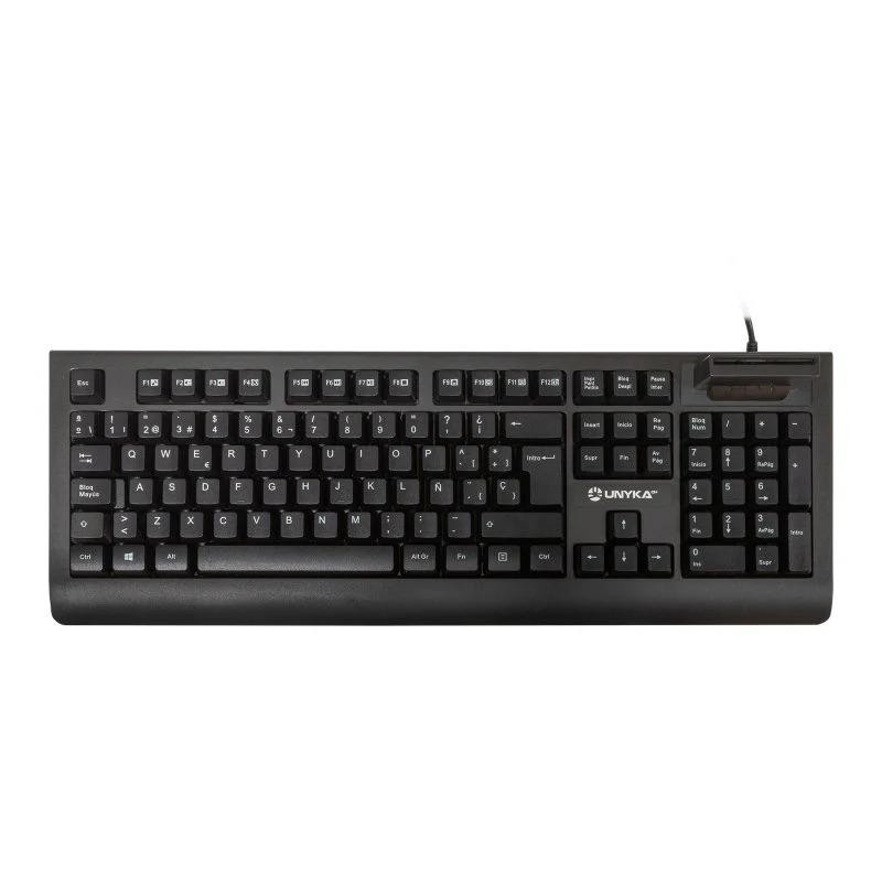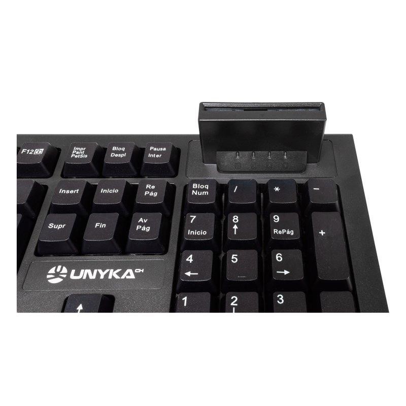 UNYKAch presenta su nuevo modelo de teclado KB918 de 105 teclas con lector inteligente de tarjetas tipo PC/SC 2.0, como el DNI electrónico o las tarjetas de sanidad. Un lector de tarjetas inteligentes que le permitirá realizar gestiones on-line con la administración, bancos, etc. de forma segura y fiable. Es el mejor soporte para realizar operaciones bancarias, gestiones de seguros, operar con organismos públicos.