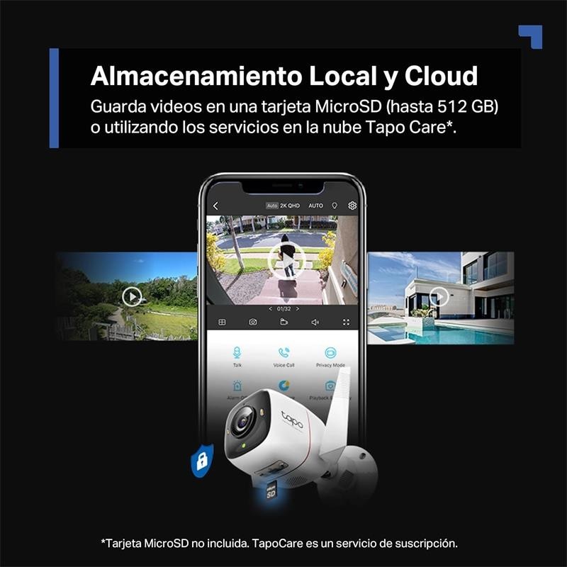 - Almacenamiento seguro: Compatible con tarjetas microSD de hasta 512 GB y servicios en la nube con Tapo Care.